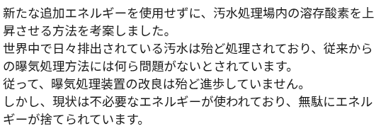 We have devised a method to increase the dissolved oxygen in a sewage treatment plant without using any new additional energy. Most of the sewage discharged daily around the world is treated, and there are no problems with the conventional aeration methods. Therefore, little progress has been made in improving aeration treatment systems. However, at present, unnecessary energy is being used and energy is being thrown away unnecessarily.