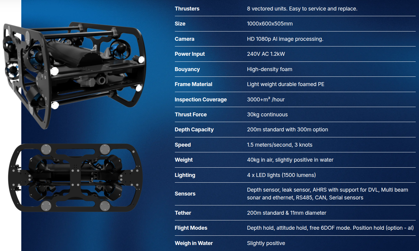 Enhanced Performance and Safety: The APAMA's hybrid power supply is a crucial safety feature; in the event of a main generator failure, a built-in backup allows the ROV to be safely flown back to the surface without needing a costly and time-consuming dive team retrieval. The advanced 6-DOF intuitive control system, developed in collaboration with end users, gives operators full control to orient the ROV in any position, ensuring tasks are completed efficiently.