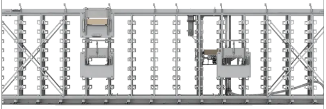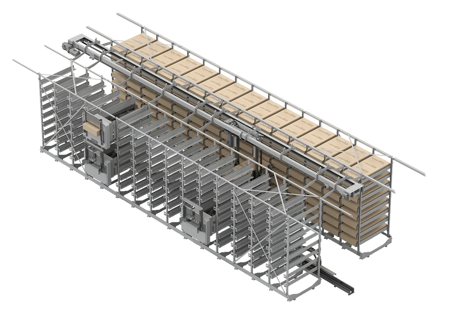 Buffering: Boxes are mechanically picked and placed on shelves, optimizing space and organization.