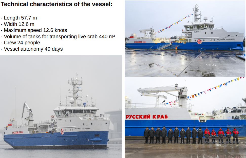 The ship is designed for sustainable crabbing and live catch transport. It features a specialized two-level hold with modern monitoring systems (temperature, salinity, oxygen) to ensure a high preservation rate of 98% for the catch.