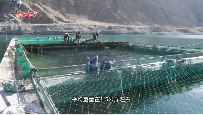 At the salmon aquaculture base near the Shimen Reservoir in Nantung Town, 38th Regiment, of the Xinjiang Production and Construction Corps' Second Division, workers are actively conducting sample checks on the growing salmon.