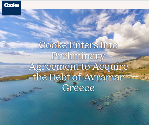 Athens – Cooke Inc. has signed a memorandum of understanding to acquire the existing debt of Avramar Aquaculture S.A., Andromeda S.A., Perseus S.A., and Avramar Commercial and Logistics S.A. (collectively, Avramar Greece), a major producer of sea bass and seabream in Greece.